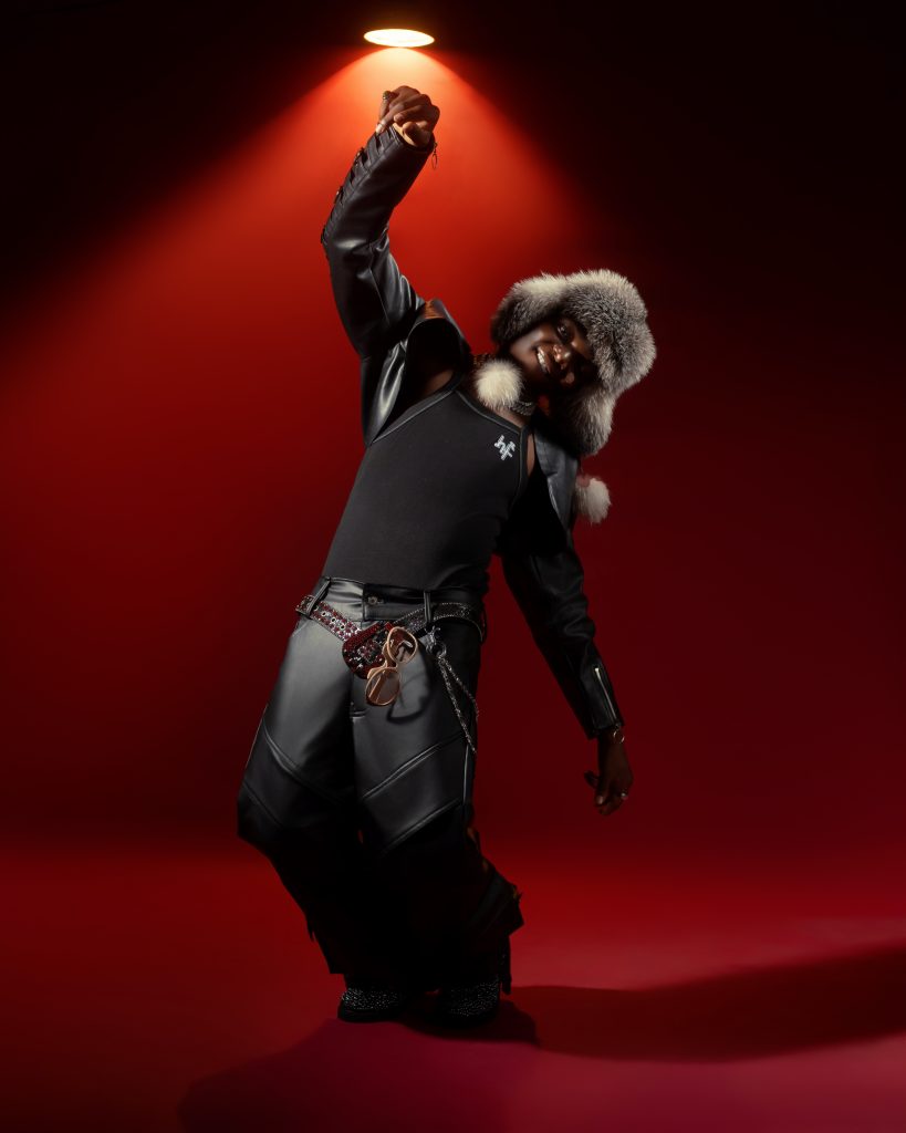 His style choices are bold but intentional. One moment he’s layered in rich textures, pairing high-fashion silhouettes with raw streetwear energy. The next, he’s stripped down to simplicity, letting his energy speak volumes. Each look tells a story. Each frame feels like a statement.
